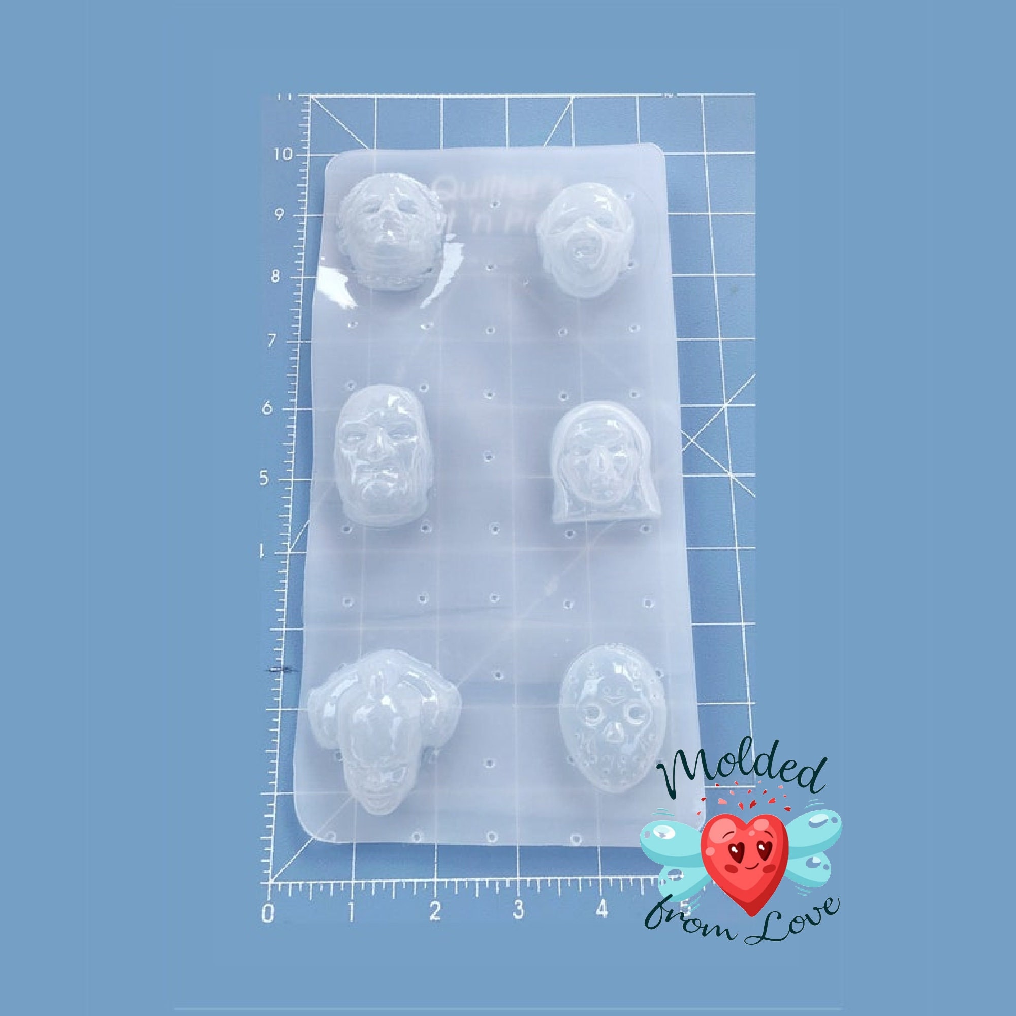 This is a handmade flexible plastic resin mold that can be used with clay, soap, chocolates ect.. Pieces should pop out easily and be shiny. This mold features 6 custom made approx. 2" Horror Movie Character heads Texas Chainsaw Hannibal Lector Freddy Kreuger Evil Nun Pennywise Jason Mask There may be small/slight 3-D print lines ★ All molds are handmade by Molded From Love and may take up to 7-10 business days to be made and shipped. ★ All molds are made out of LDPE plastic (not silicone). The plastic I use is a semi-hard, yet flexible plastic, Lightweight and 100% recyclable. Very little to no moisture absorption. ★ It is a food grade plastic with melting point of 220°F. If you use the mold with non-food materials, please be sure to only use that particular mold with non-food items. I suggest purchasing a second mold if you intend to make food items. ★ This mold may be used with bath bomb materials, soap, wax, resin, clay, plaster, fondant, chocolate, candy and so much more. ★ Please check the size of the mold to make sure it will work for your purchase. Some molds are small and made for resin, while others are for bath bombs/Soaps chocolates ect. I post the size in description as well as photo the mold on a measuring board. Each square is 1" inch. ★ Do not put near any extreme heat source such as an oven, dishwasher, microwave or open flame. The molds will melt. ★ You may sell items created using my molds such as bath bombs, soaps, wax melts, candy, jewelry, etc. However, reselling my molds and/or remolding and then selling those molds is not allowed. ★ If you have any questions before purchasing, please feel free to contact me. Molded from love 2021 If pieces come out not shiny, simply coat with resin or resin spray. That is what I do with all of my pieces anyway. Do not put in the oven.