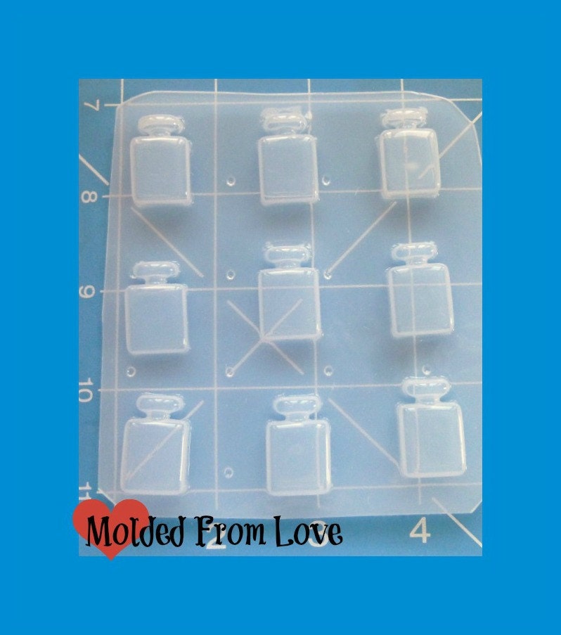 *************************************************************************** This is a handmade flexible plastic resin mold. Molded to look like a Vintage Chanel Perfume Bottle this is a little bottle perfect size for a pendant or ring or earrings *************************************************************************** This mold features 9 tiny size ( 1") Vintage Perfume Bottle Shapes Great size for rings, earrings ect. *************************************************************************** Do not put in the oven. **************************************************************************** Feel free to contact me with any questions.